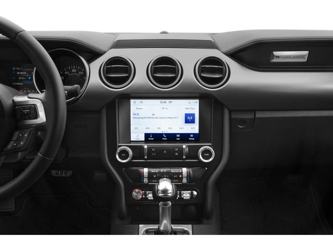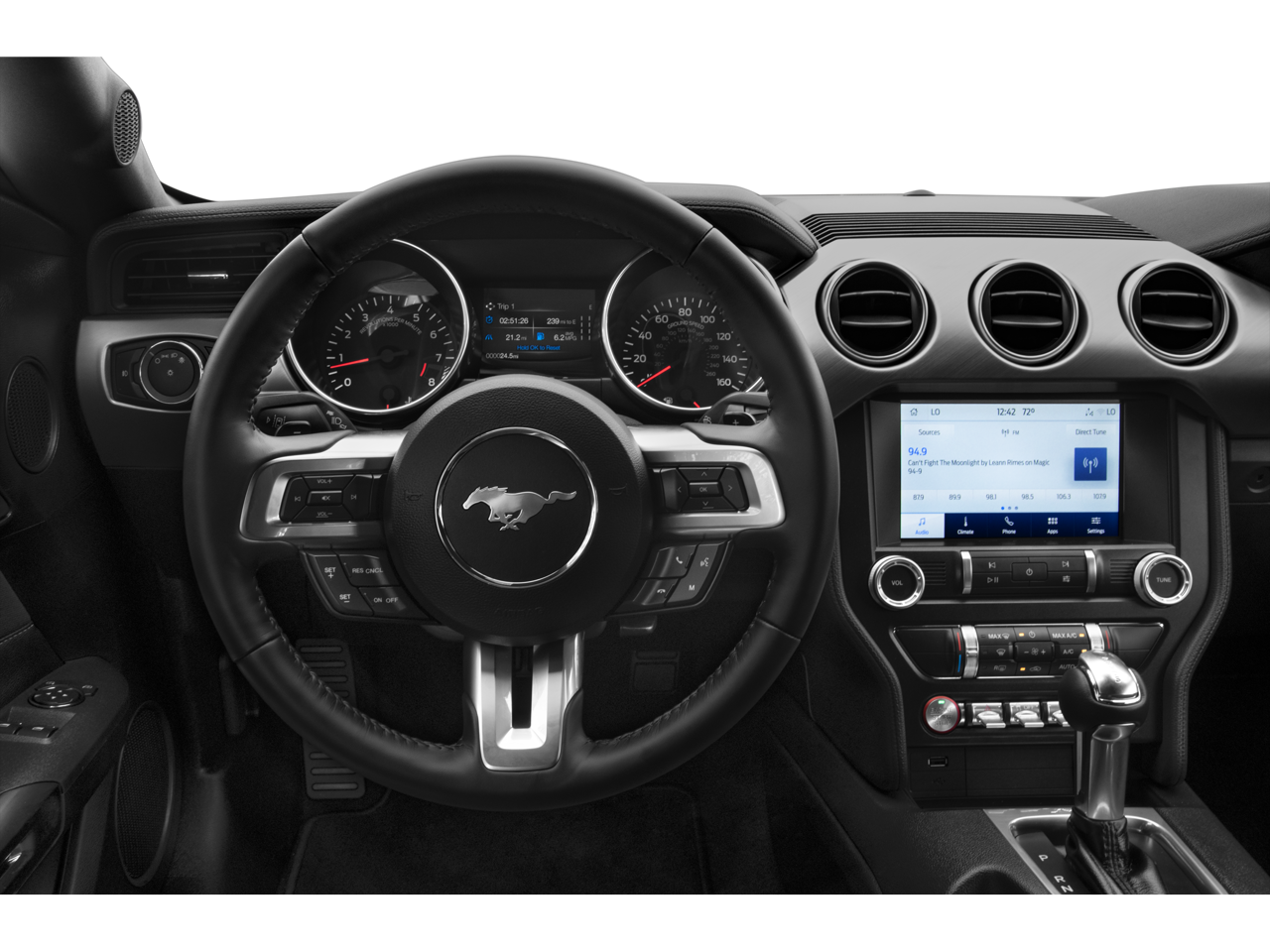 The interior of this Mustang GT is equally impressive, with premium features that cater to your every need. The Equipment Group 301A package includes Ambient Lighting with MyColor, a 4.2-inch cluster, Dual-Zone Automatic Temperature Control, Illuminated Door-Sill Scuff Plates, and Selectable Drive Modes with Toggle Switches.