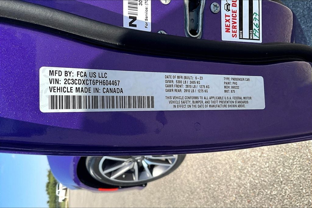 2023 Dodge Charger R/T R/T Plum Crazy Pearlcoat 4D Sedan RWD HEMI 5.7L V8 Multi Displacement VVT 8-Speed Automatic 1 Owner, New Feature, Charger R/T, 4D Sedan, HEMI 5.7L V8 Multi Displacement VVT, 8-Speed Automatic, RWD, Plum Crazy Pearlcoat, Black Cloth, 1-Yr SiriusXM Guardian Trial, 2-Piece Shark Fin Antenna, 4-Wheel Disc Brakes, 4G LTE Wi-Fi Hot Spot, 6 Speakers, 8.4 Touchscreen Display, ABS brakes, Air Conditioning, Alloy wheels, AM/FM radio: SiriusXM, Anti-whiplash front head restraints, Apple CarPlay, Apple CarPlay/Android Auto, Auto-dimming Rear-View mirror, Automatic temperature control, Brake assist, Bumpers: body-color, Cloth Performance Seats, Compass, Delay-off headlights, Driver door bin, Driver vanity mirror, Dual front impact airbags, Dual front side impact airbags, Electronic Stability Control, Emergency communication system: SiriusXM Guardian, For Details, Visit DriveUconnect.com, Four wheel independent suspension, Front anti-roll bar, Front Bucket Seats, Front Center Armrest, Front dual zone A/C, Front License Plate Bracket, Front reading lights, Fully automatic headlights, Garage door transmitter: HomeLink, Google Android Auto, GPS Antenna Input, HD Radio, Heated door mirrors, Illuminated entry, Integrated Center Stack Radio, Integrated Voice Command w/Bluetooth®, Knee airbag, Leather Shift Knob, Low tire pressure warning, Manufacturer's Statement of Origin, Media Hub (2 USB, AUX), Occupant sensing airbag, Outside temperature display, Overhead airbag, Overhead console, Panic alarm, ParkView Rear Back-Up Camera, Passenger door bin, Passenger vanity mirror, Power 2-Way Driver Lumbar Adjust, Power 8-Way Driver Seat, Power door mirrors, Power driver seat, Power steering, Power windows, Quick Order Package 26N, Radio: Uconnect 4C w/8.4 Display, Rear anti-roll bar, Rear Armrest w/Cupholder Seat, Rear reading lights, Rear seat center armrest, Rear window defroster, Remote keyless entry, Speed control, Speed-Sensitive Wipers, Split folding rear seat, Spoiler, Sport steering wheel, Steering wheel mounted audio controls, Tachometer, Telescoping steering wheel, Tilt steering wheel, Traction control, Trip computer, USB Host Flip, Variably intermittent wipers, Wheels: 20 x 8 Machined w/Granite Pocket.