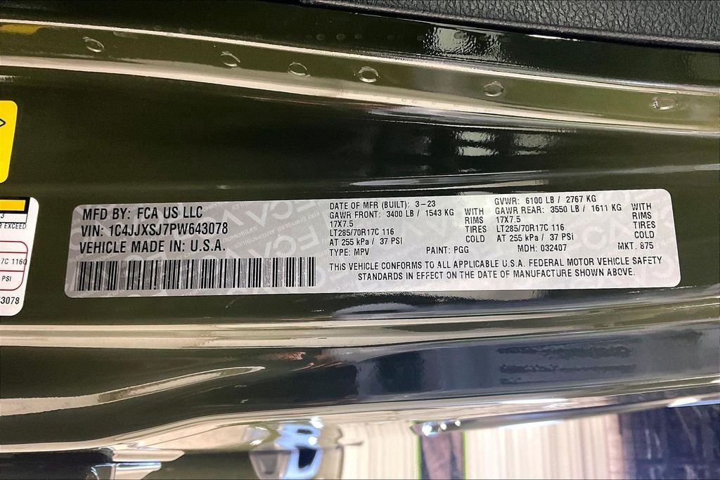 2023 Jeep Wrangler Rubicon 392 Rubicon 392 Sarge Green Clearcoat 4D Sport Utility 4WD SRT HEMI 6.4L V8 MDS 8-Speed Automatic Wrangler Rubicon 392, 4D Sport Utility, SRT HEMI 6.4L V8 MDS, 8-Speed Automatic, 4WD, Sarge Green Clearcoat, Black Leather, 7 & 4 Pin Wiring Harness, Air Conditioning, Alloy wheels, Apple CarPlay/Android Auto, Automatic temperature control, Class II Receiver Hitch, Convertible HardTop, Front dual zone A/C, Navigation System, Power door mirrors, Power steering, Quick Order Package 27X Rubicon 392, Radio: Uconnect 4C Nav w/8.4 Display, Rear Window Defroster, Remote keyless entry, Steering wheel mounted audio controls, Trailer Tow Package.