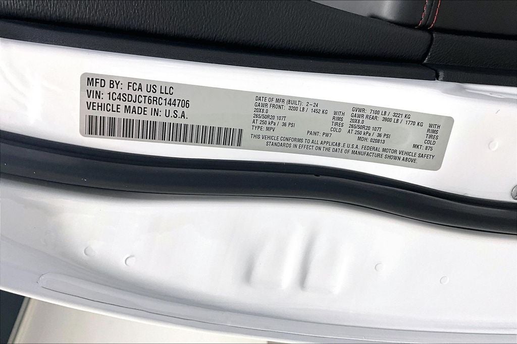 2024 Dodge Durango R/T Plus R/T Plus White Knuckle Clearcoat 4D Sport Utility AWD HEMI 5.7L V8 Multi Displacement VVT 8-Speed Automatic Durango R/T Plus, 4D Sport Utility, HEMI 5.7L V8 Multi Displacement VVT, 8-Speed Automatic, AWD, White Knuckle Clearcoat, Black Leather, 115V Auxiliary Power Outlet, 7 & 4 Pin Wiring Harness, 9 Speakers, Adaptive Cruise Control w/Stop, Air Conditioning, AM/FM radio: SiriusXM w/360L, Auto-Dimming Exterior Driver Mirror, Automatic temperature control, Black Roof Rails, Blacktop Package, Blind Spot w/Trailer Detection, Class IV Receiver Hitch, Dual Remote USB Port - Charge Only, Exterior Mirrors w/Heating Element, Exterior Mirrors w/Memory, Exterior Mirrors w/Supplemental Signals, Floor Console w/Leather Armrest, Front dual zone A/C, Full Speed Forward Collision Warning Plus, Gloss Black Badges, Gloss Black Exterior Mirrors, Heated Second Row Seats, Integrated Roof Rail Crossbars, Leather Trimmed Bucket Seats, Leather Wrapped Door Panels, LED Auxiliary Low Beam & Turn Signal, Navigation system: TomTom, Power 6x9 Multi-Function Foldaway Mirrors, Power 8-Way Driver Memory 8-Way Passenger Seats, Power Driver/Passenger 4-Way Lumbar Adjust, Power Sunroof, Power Tilt & Telescopic Steering Column, Quick Order Package 22T R/T Plus, Radio data system, Radio: Uconnect 5 Nav w/10.1 Display, Radio/Driver Seat/Mirrors Memory, Rear air conditioning, Rear window defroster, Red Accent Stitching, Satin Black Dodge Tail Lamp Badge, Trailer Brake Control, Ventilated Front Seats.