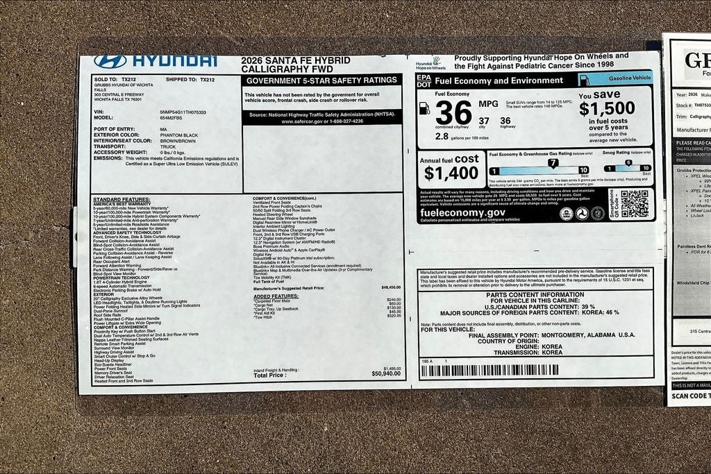 The Santa Fe Hybrid Calligraphy's striking black exterior exudes a bold and confident presence, while the spacious and well-appointed cabin provides a truly premium driving experience. With its advanced hybrid powertrain, you'll enjoy exceptional fuel efficiency without sacrificing performance, with an EPA-estimated 37 mpg in the city and 36 mpg on the highway.